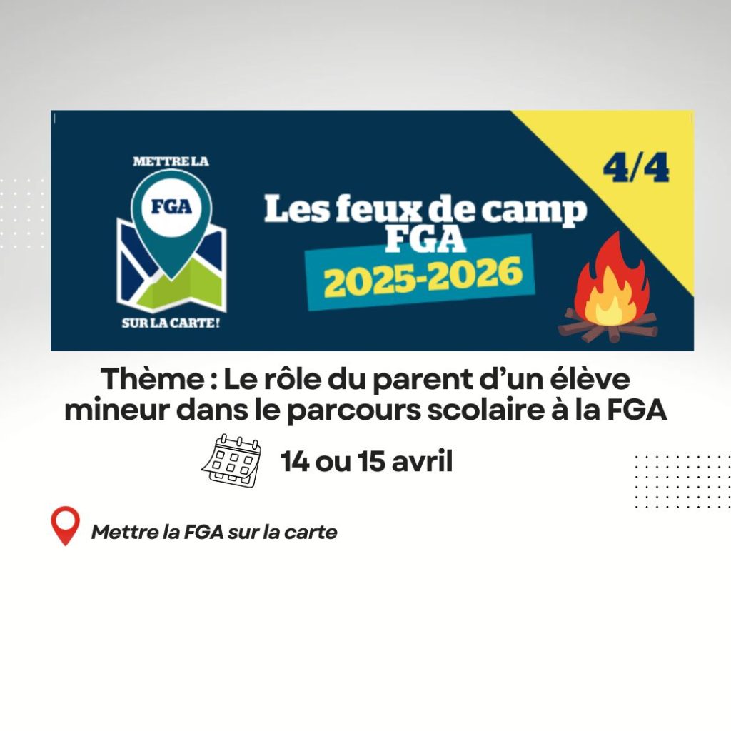 Le 4e feu de camp de l’année 2025-2026 portera sur LE RÔLE DU PARENT D’UN ÉLÈVE MINEUR DANS LE PARCOURS SCOLAIRE À LA FGA. Plus précisément, il sera question de sa portée, de son utilité et de ses limites.