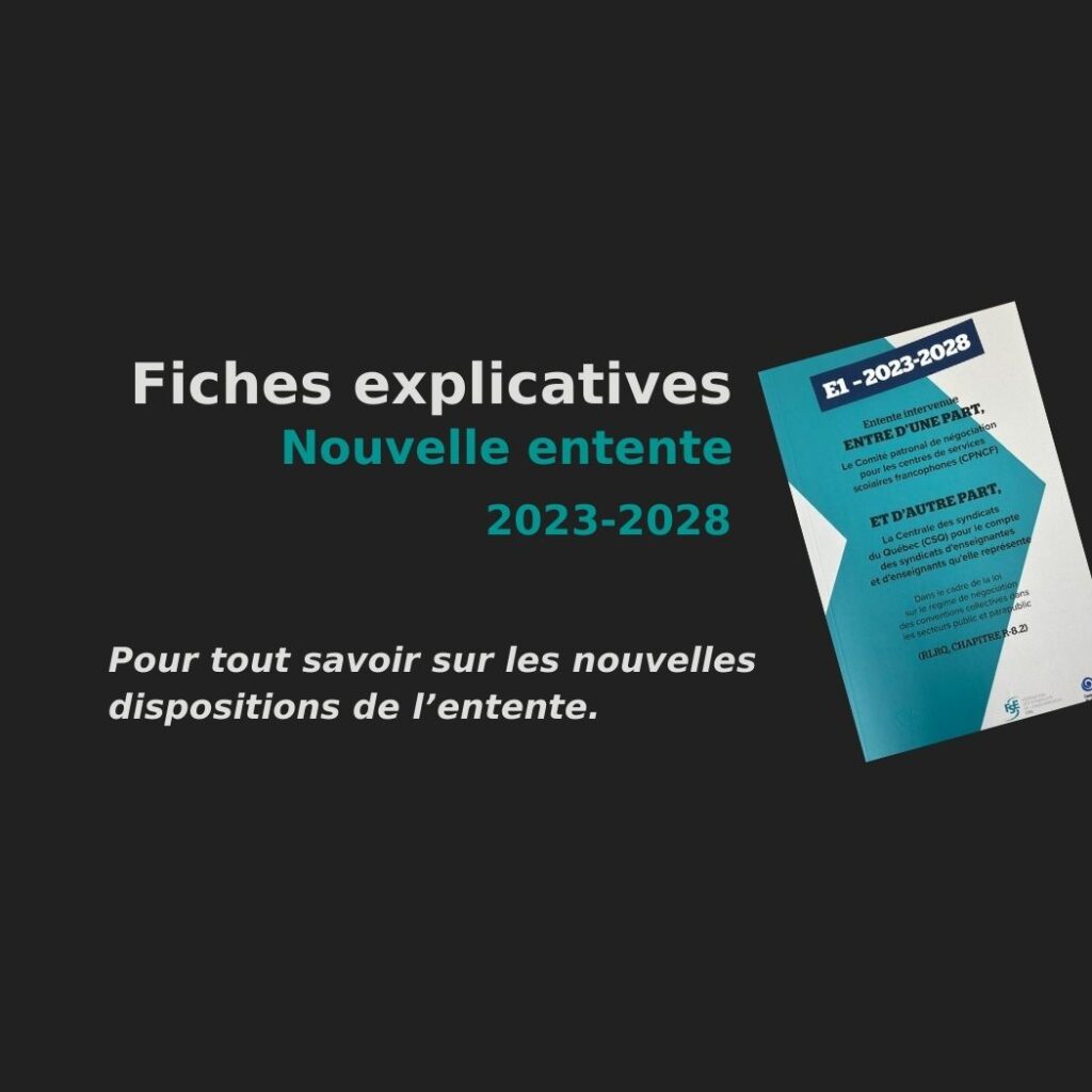 La convention collective 2023-2028 contient de nombreux changements. Pour soutenir les enseignants et les enseignantes dans l’appropriation de ces nouvelles dispositions, l’équipe du SEDR-CSQ, en collaboration avec la FSE, a élaboré des fiches explicatives. Celles-ci ont été présentées dans le cadre d’une formation donnée à tous les membres du SEDR-CSQ le 28 octobre dernier et ont été déposées sur notre site Internet. Vous souhaitez consulter leur contenu?