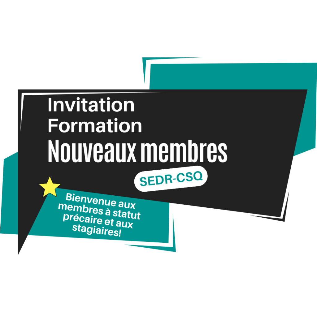 C’est avec un bel engouement que le comité des jeunes convie les nouvelles et les nouveaux membres du SEDR-CSQ, les membres à statut précaire et les stagiaires à une formation conçue sur mesure pour eux. Celle-ci se tiendra en fin de journée le mercredi 20 novembre au Travelodge. Une boite repas sera servie sur place à toutes les personnes présentes et préalablement inscrites.