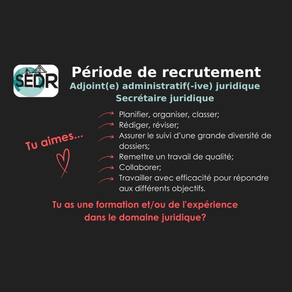 Le SEDR-CSQ est actuellement à la recherche d’un(e) adjoint(e) administratif(-ive) juridique (secrétaire juridique) pour compléter son équipe de feu!