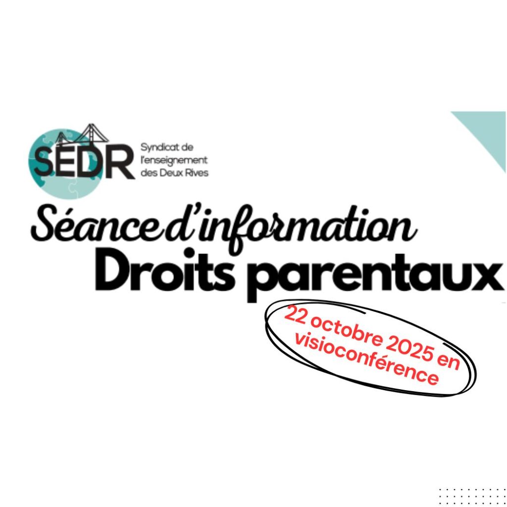 L’inscription à la formation portant sur les droits parentaux est ouverte. La prochaine séance d’information sera donnée le 22 octobre 2025 en visioconférence à 18 h. Nous prendrons les inscriptions jusqu’au 20 octobre.